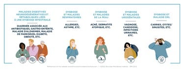 Tout déséquilibre du microbiote intestinal (dysbiose) peut potentiellement entraîner des effets négatifs sur la santé à l'avenir :